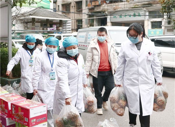 “这几天下来,老百姓在网上看到你们医生和护士坚守在疫情防控一线太辛苦了,这1200多斤的蔬菜是全体村民的一点心意。我们都是一家人,大家都是一条心!”挂丁村党支部书记杨军一边在车上帮忙搬运蔬菜,一边开心的说到。